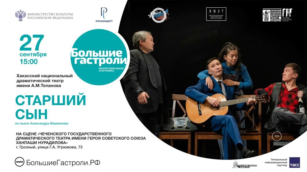 Театр Топанова представит гостям, участникам и жителям города Грозного спектакль - «Старший сын» (12+) по пьесе классика советской драматургии Александра Вампилова. Постановка, осуществленная заслуженным деятелем искусств Республики Хакасия Саяной Ултургашевой в марте 2025 года, успела завоевать признание зрителей и была отобрана для участия в фестивале экспертной комиссией Союза театральных деятелей России.