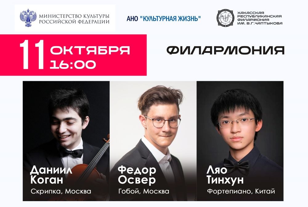 11 октября в столице Хакасии состоится концерт лауреатов международных и всероссийских конкурсов. На сцене Хакасской республиканской филармонии выступят молодые российские исполнители: лауреат II премии и обладатель серебряной медали XVII международного конкурса им. П. И. Чайковского (2023) Федор Освер (гобой), лауреат III премии и обладатель бронзовой медали XVII Международного конкурса им. П.И. Чайковского (2023) Даниил Коган (скрипка) и лауреат III премии и обладатель бронзовой медали II Международного конкурса пианистов, композиторов и дирижеров имени С.В. Рахманинова (2025) Ляо Тинхун (фортепиано).