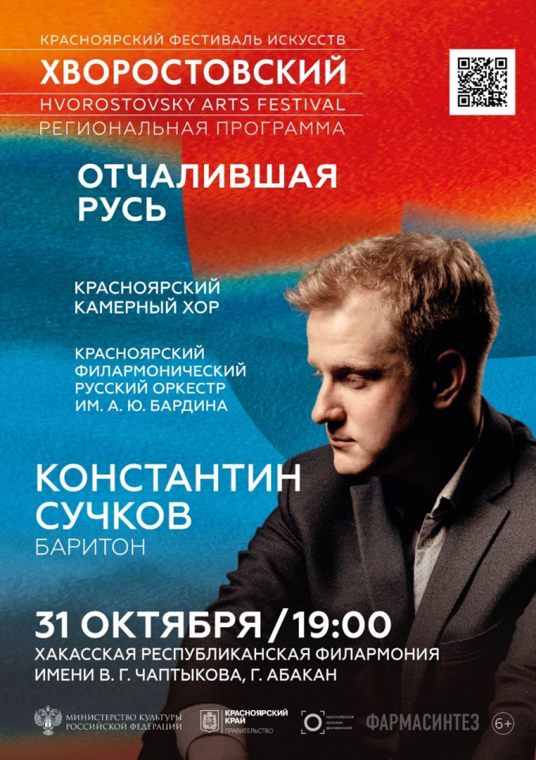 31 октября в Хакасской республиканской филармонии в рамках Фестиваля искусств «Хворостовский» пройдёт вокальный цикл «Отчалившая Русь». На сцену выйдут Константин Сучков (баритон), Красноярский камерный хор и Красноярский филармонический русский оркестр имени А.Ю. Бардина под управлением маэстро Тимура Кабдушева.