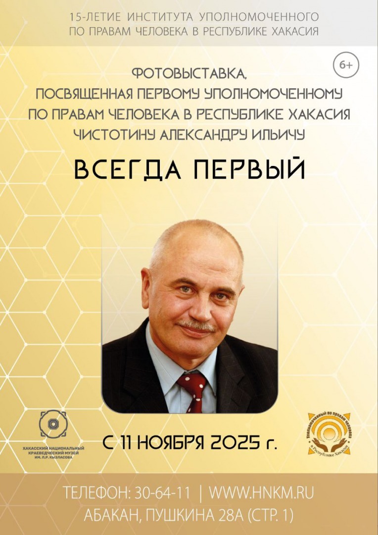 11 ноября в 11.00 в Зимнем саду откроется выставка «Всегда первый», посвящённая 15-летию Института Уполномоченного по правам человека в Республике Хакасия и первому Уполномоченному - Александру Ильичу Чистотину. Это не просто юбилей, а признание важной роли, которую институт сыграл в жизни республики, защищая права и свободы её жителей.