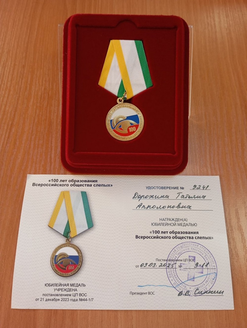 Руководитель Хакасской библиотеки для слепых награждена юбилейной медалью Всероссийского общества слепых