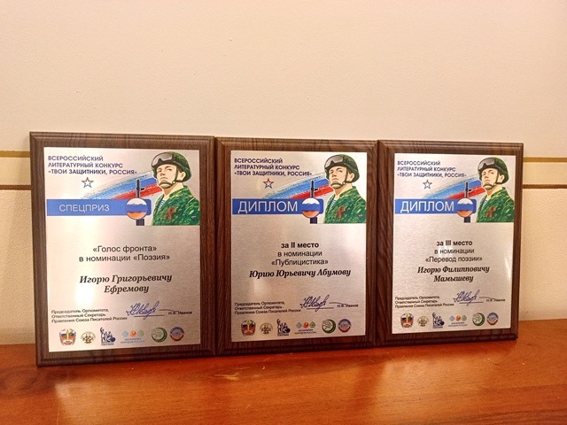 Хакасию на конкурсе достойно представили три писателя Хакасского регионального отделения Союза писателей России. Игорь Мамышев занял 3-е место в номинации «Перевод поэзии» с авторским переводом с хакасского языка стихотворения «Михаилу Тодинову, простому Верх-Аскизскому парню». Юрий Абумов удостоен 2-го места в номинации «Публицистика» за очерк «Доля военного хирурга – спасать и отпускать жизнь солдата». Игорь Ефремов, участник СВО (позывной «Кобзарь»), получил специальный приз ООО «Родина — Конгресс русских общин» в номинации «Поэзия». Его творчество сегодня имеет особую силу: он пишет честно, прямо с передовой, совмещая роль защитника и поэта, чьи строки звучат как живое свидетельство времени.