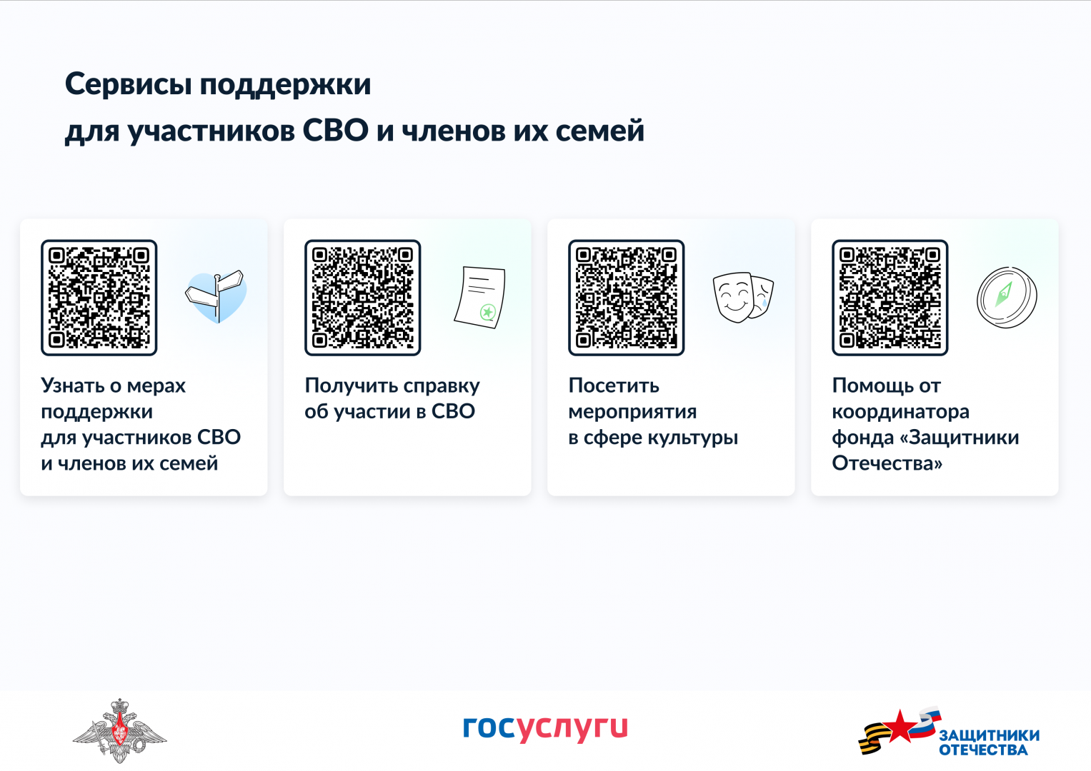 Сервис поддержки включает ссылки, ведущие на тематические разделы на портале «Госуслуги» – о получении статуса ветерана боевых действий или справки об участии в СВО, где записаться на мероприятия в сфере культуры или получить помощь от координатора в своем регионе.