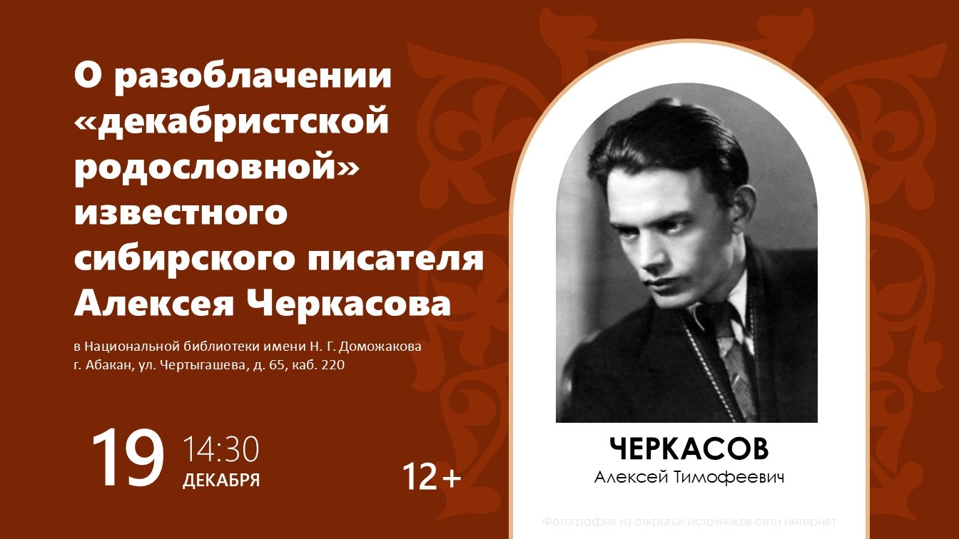 О разоблачении «декабристской родословной» известного сибирского писателя Алексея Черкасова расскажет Алексей Нилогов на встрече клуба «Моя родословная»