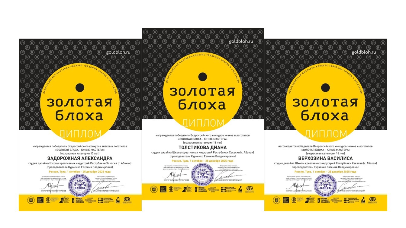 С 1 октября по 1 ноября 2025 г. проходил прием работ на Всероссийский конкурс знаков и логотипов «Золотая блоха — юные мастера», по итогам которого три учащиеся студии «Дизайн» Школы креативных индустрий Республики Хакасия стали победителями в возрастной категории до 13 и 16 лет.