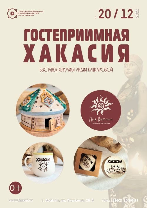 20 декабря в 16:00 в этнокафе «Чабрец» откроется выставка «Гостеприимная Хакасия», где представлены авторские керамические изделия мастера Лидии Владимировны Кашкаровой. В экспозиции - чайники, кружки, чайные пары и другие предметы посуды, созданные с любовью и вдохновением.
