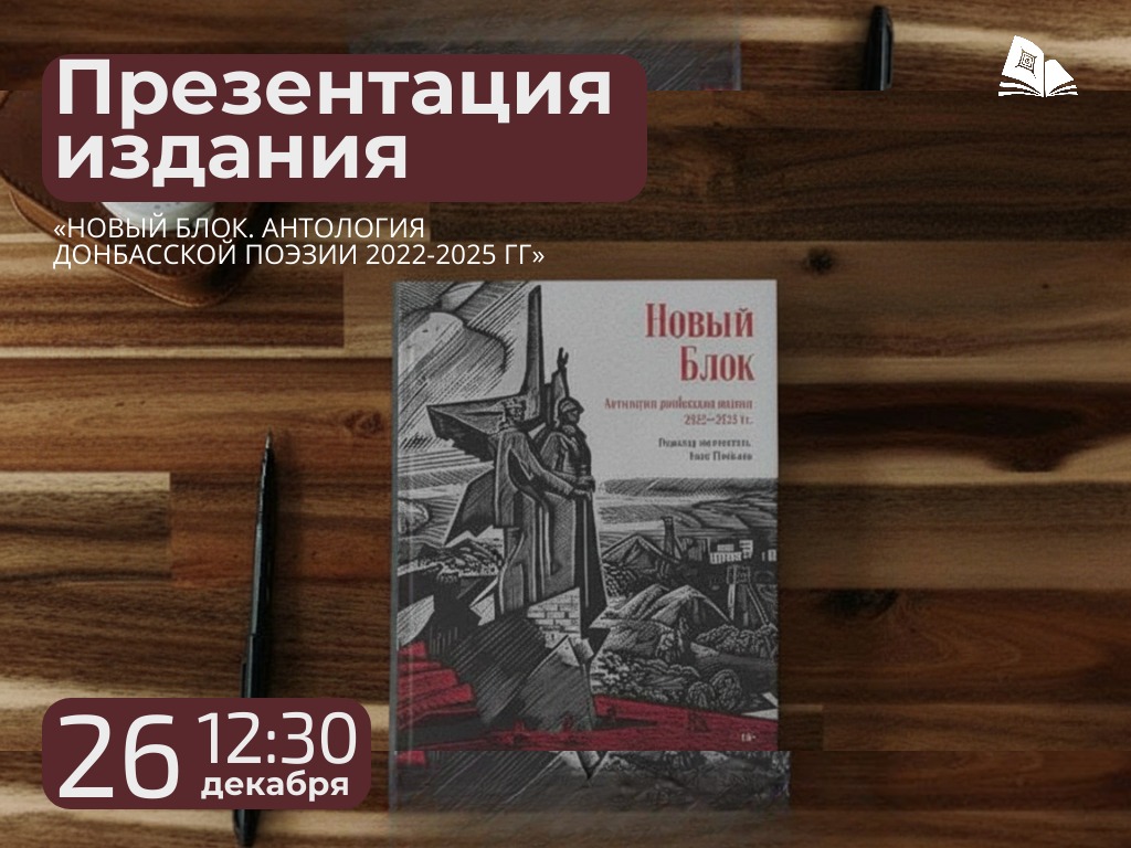 26 декабря в 12:30 в Национальной библиотеке имени Н. Г. Доможакова (ул. Чертыгашева, 65, 3-й этаж, к. 312) презентуют продолжение легендарного литературного проекта «Великий Блокпост» – «Новый Блок. Антология донбасской поэзии 2022–2025 гг.».
