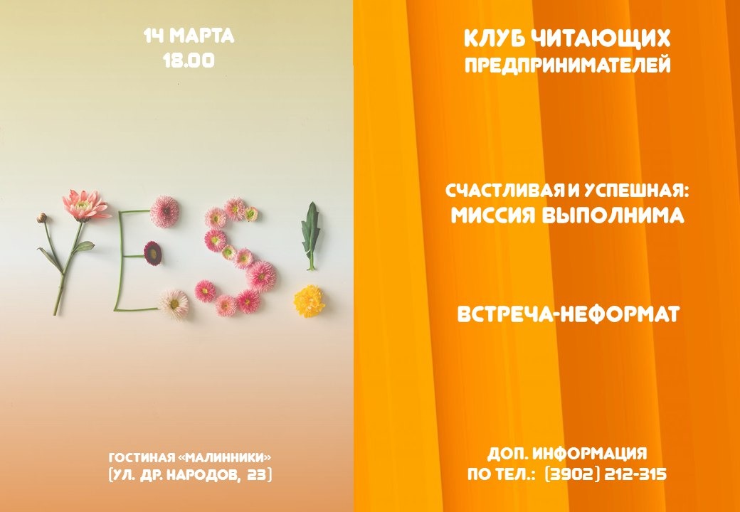 Обращаем внимание, что на встречу необходимо записаться по телефону: 8-906-191-85-50 или в группе «Клуб читающих предпринимателей» ВКонтакте.