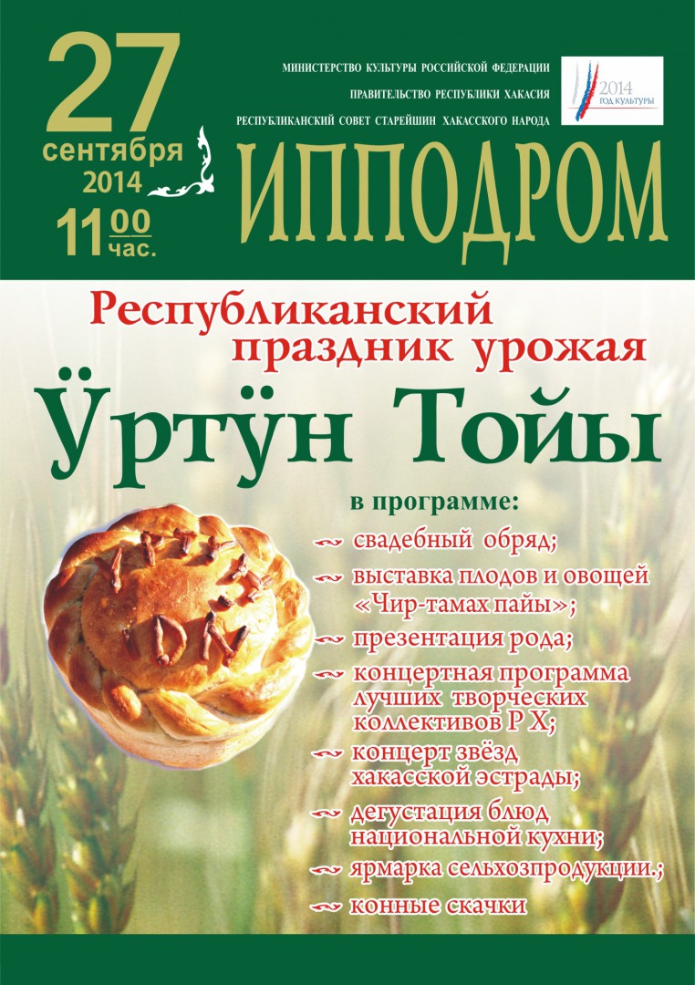 Республиканский праздник урожая «Уртун Тойы» пройдет 27 сентября на территории республиканского ипподрома. В этом году он посвящен 10-летию принятия Закона Республики Хакасия «О дне тюркской письменности и культуры». В программе примут участие все муниципальные образования республики. Подготовку к празднику ведет Центр культуры и народного творчества имени С.П. Кадышева при поддержке Министерства культуры Республики Хакасия.